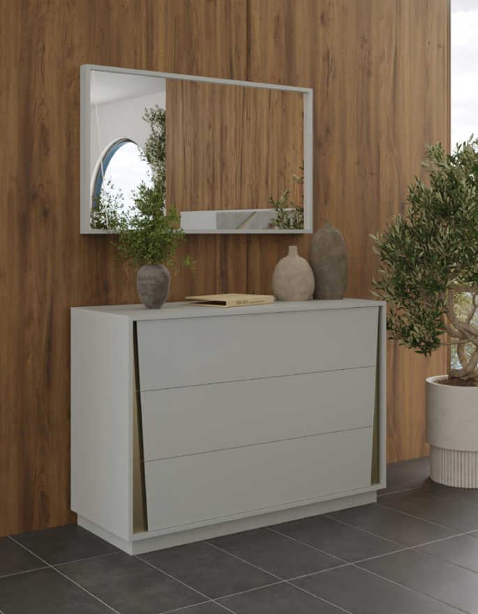 Madeira lacada, tecido e metal dourado escovado